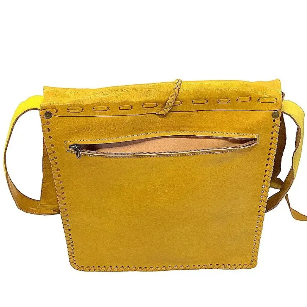 The Quirvow leather crossbody bag is made from genuine leather in yellow, handcrafted in Morocco. The bag has an unstructured shape with natural raw unfinished edges that are part of the design. Each piece is cut from a single section of leather which means the outline and natural markings will vary between bags.